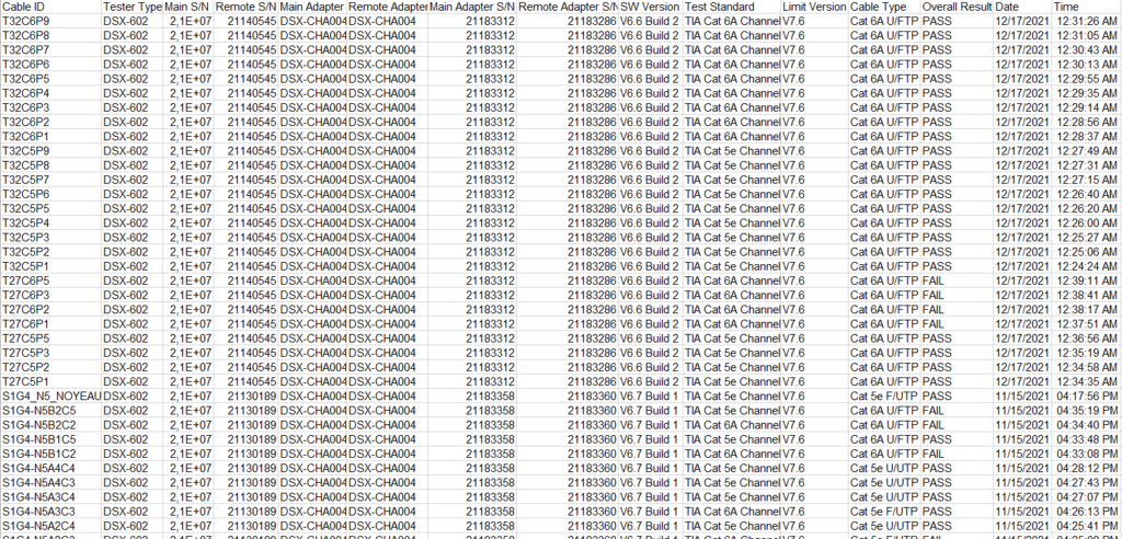 Voici les résultats exportés du Fluke concernant les mesures de prises RJ45.