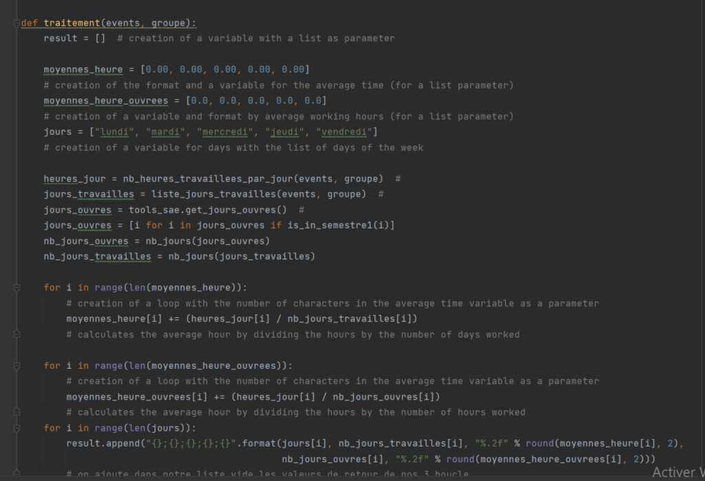 Tout au long de la SAE 15, nous avons utilisé Python pour créer un projet. Ce projet consiste à réaliser des traitements de données sur un agenda de l’IUT, incluant le nombre de cours, de professeurs, de classes et d’élèves, ainsi que la gestion de l’emploi du temps. Nous avons donc importé les résultats stockés dans un fichier CSV pour les analyser.