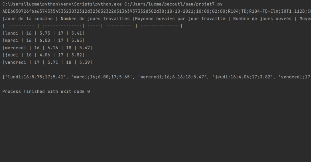 markdown += "|Jour de la semaine | Nombre de jours travaillés |Moyenne horaire par jour travaillé | " \